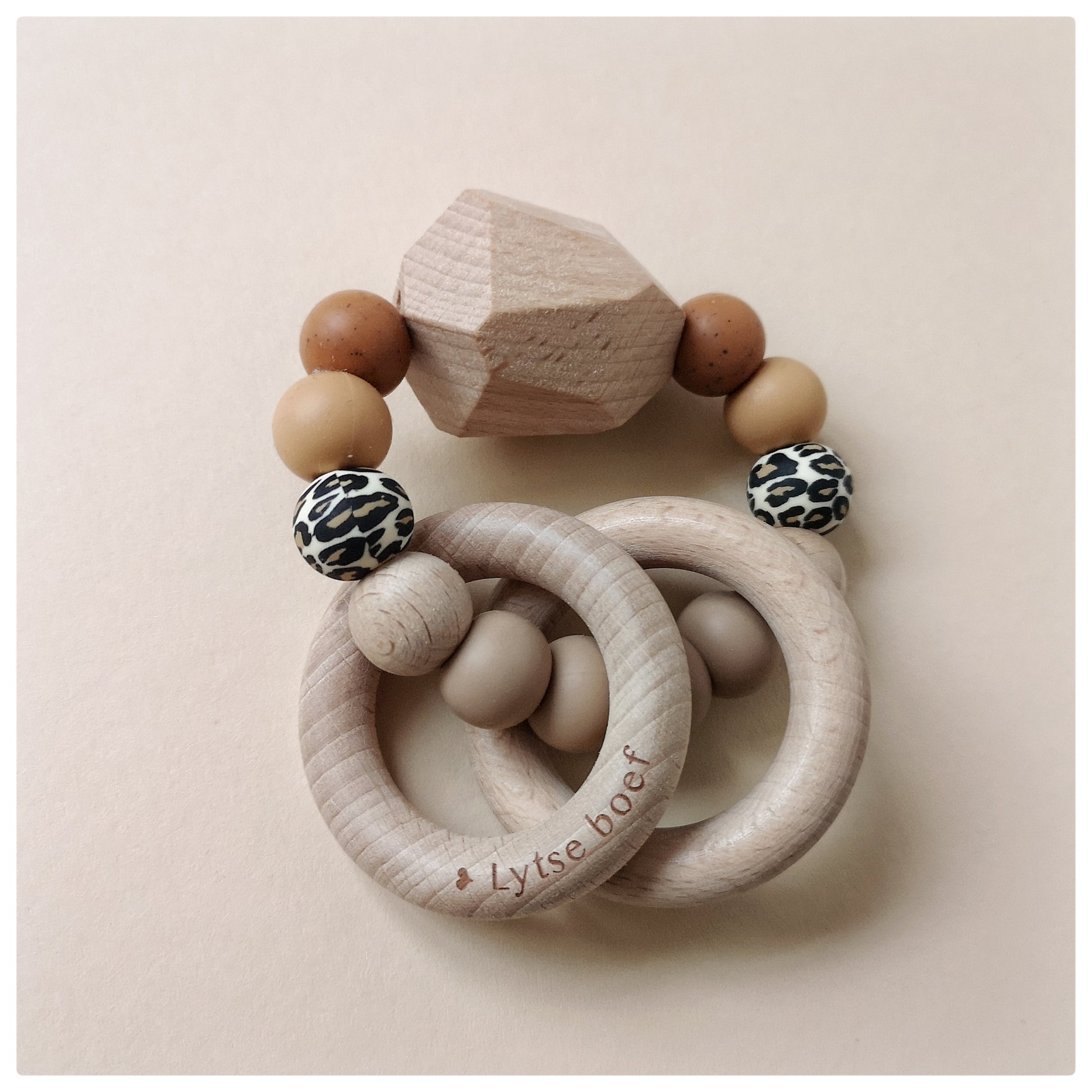 Deze siliconen kralenringen zijn met kralen van 15mm met panterprint. Deze zijn geschikt voor kindjes vanaf 3 maanden ongeveer wanneer ze hun eerste tandjes krijgen.