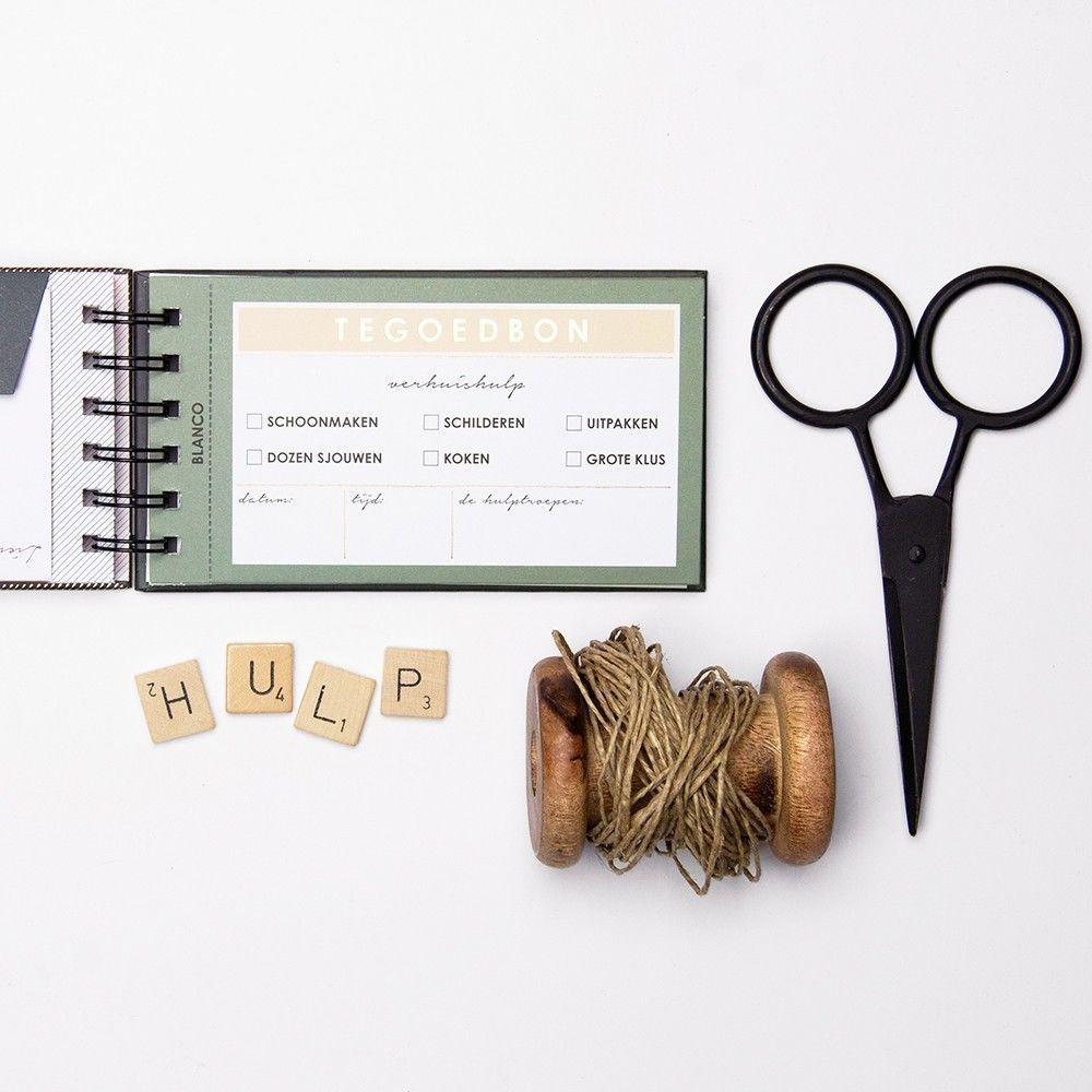 Heb je ook dierbaren in je omgeving die wel wat hulp kunnen gebruiken? Van een puberzoon tot een hulpbehoevende oma. Dit boekje bevat 12 tegoedbonnen voor een klusje, er is ook ruimte om een persoonlijk berichtje en de voorwaarden te vermelden. Zowel de cover als het binnenwerk bevatten prachtige illustraties met goud folie, je scheurt de tegoedbonnen makkelijk uit, vouwt hem dicht tot envelop en sluit deze met de bijgeleverde stickers dicht. Er is ruimte om een persoonlijk berichtje toe te voegen of de voorwaarden van de bon te vermelden.