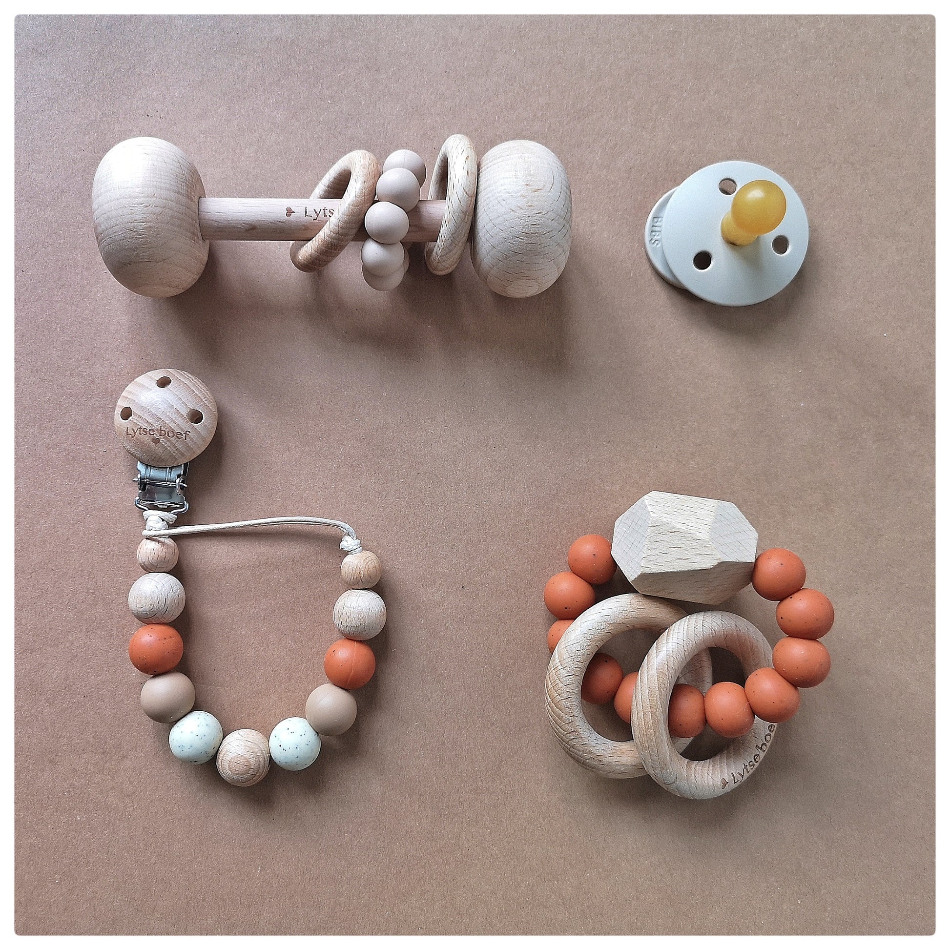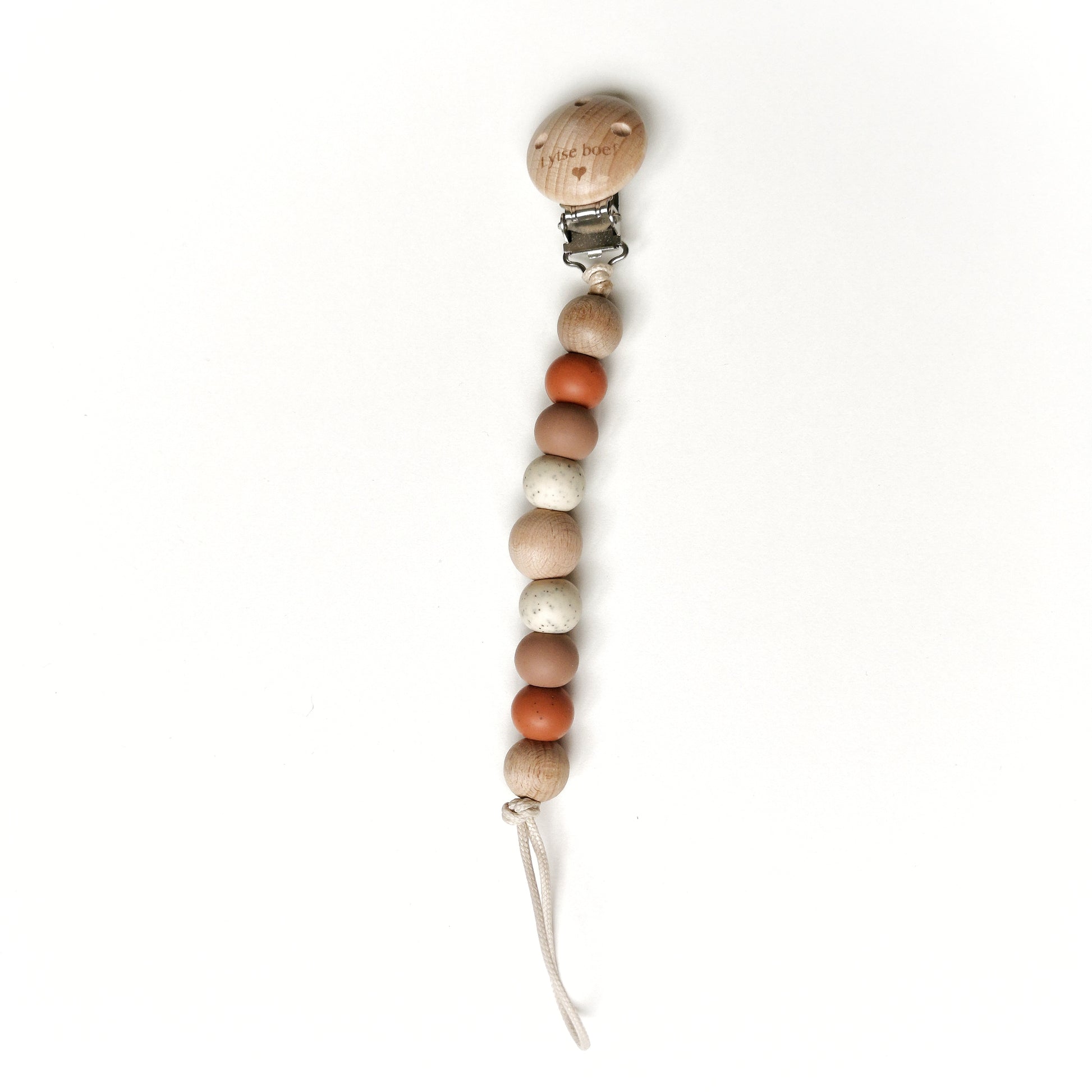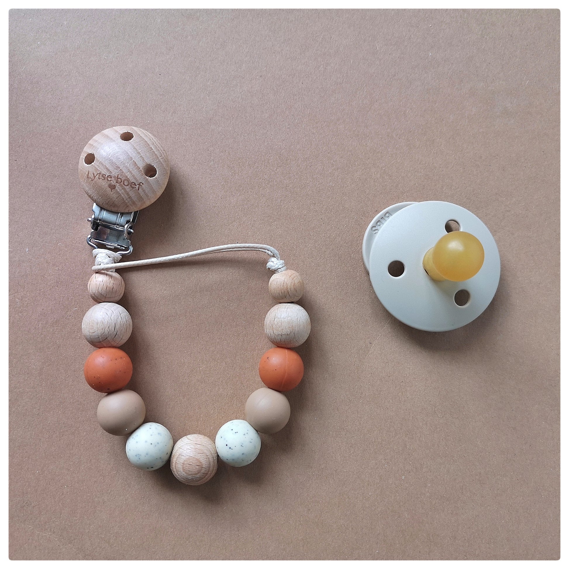 Het speenkoord is gemaakt met beuken houten en BPA-vrije siliconen kralen. Deze is maximaal 22cm in verband met de Nederlandse veiligheidsnorm.