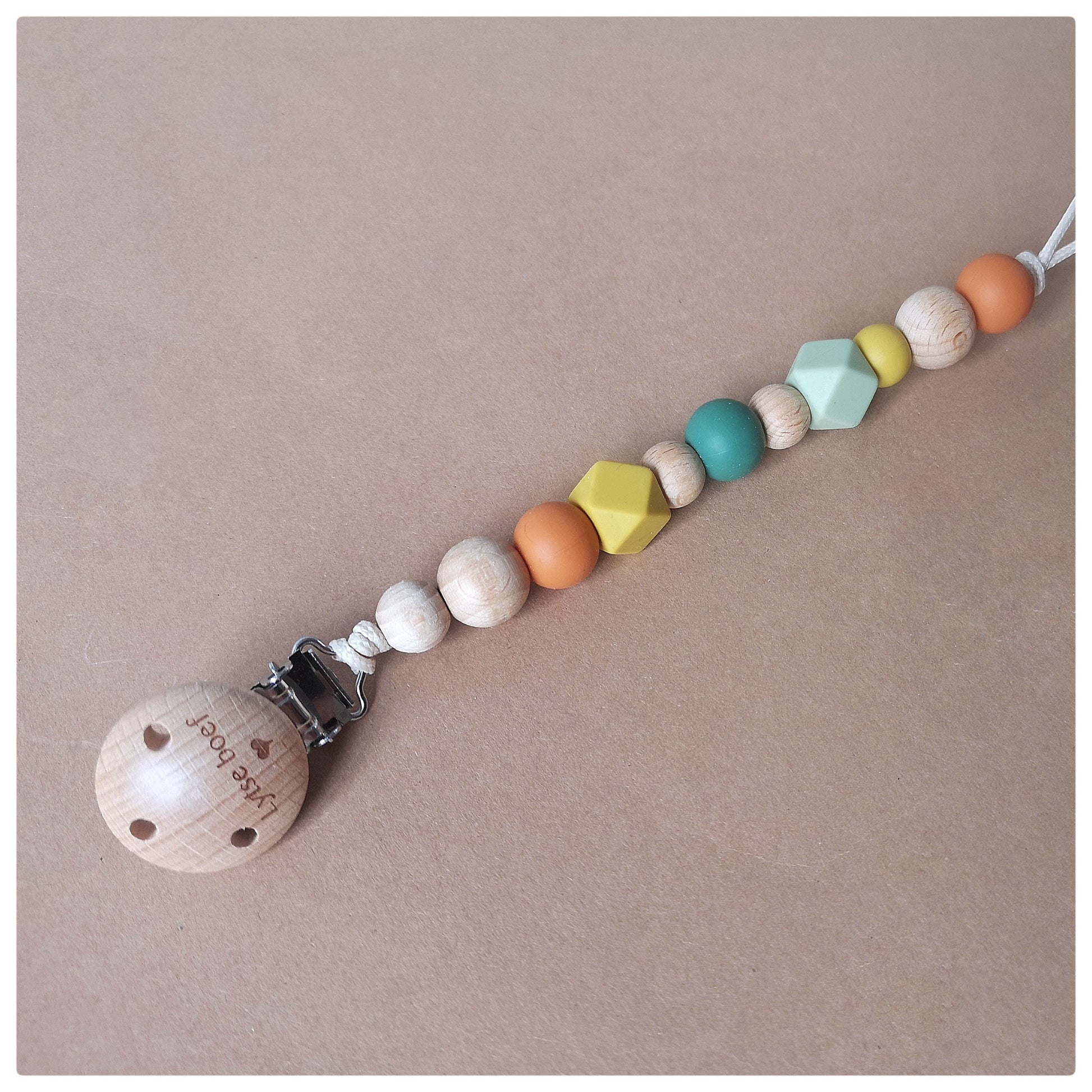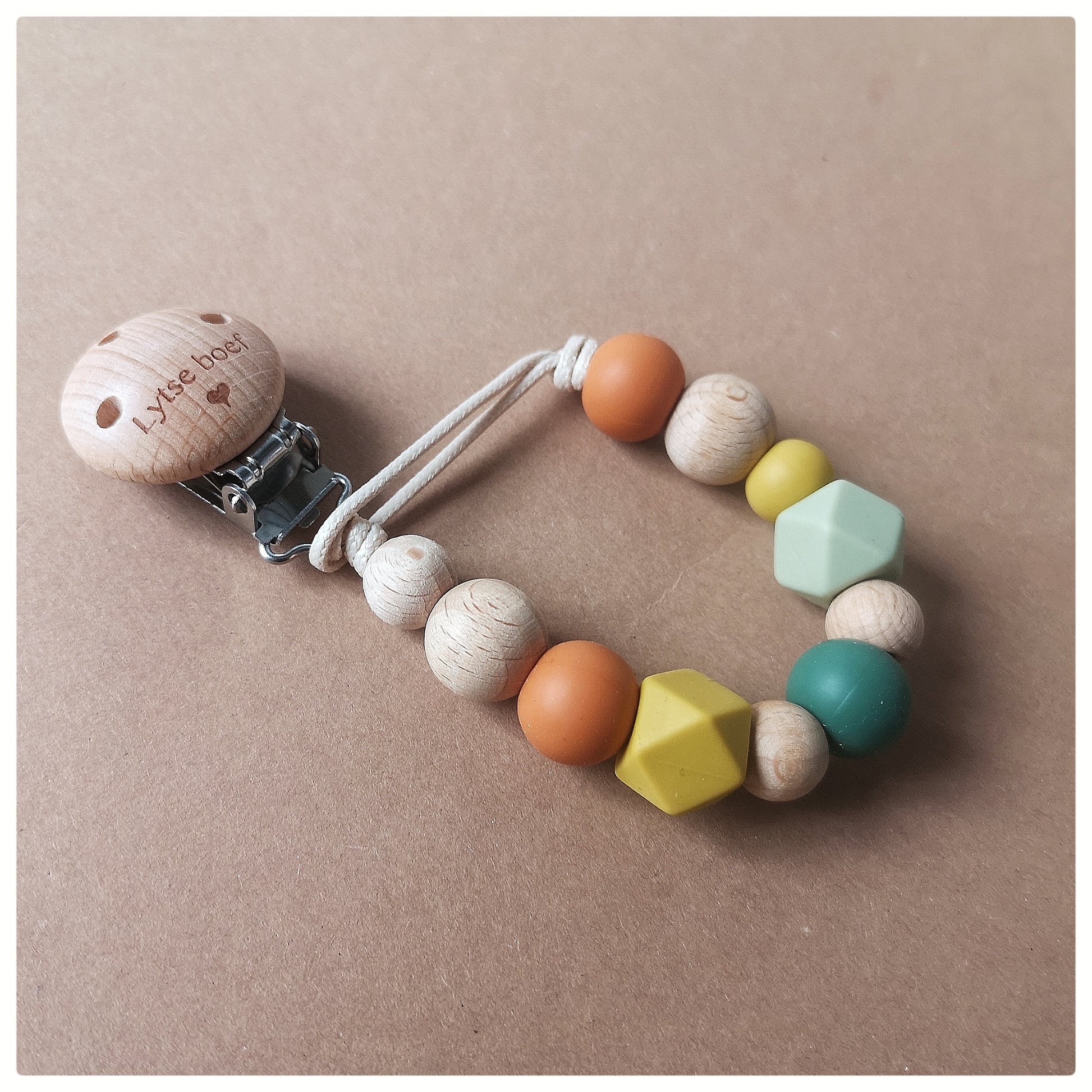 Het speenkoord is gemaakt met beuken houten en BPA-vrije siliconen kralen. Deze is maximaal 22cm in verband met de Nederlandse veiligheidsnorm.