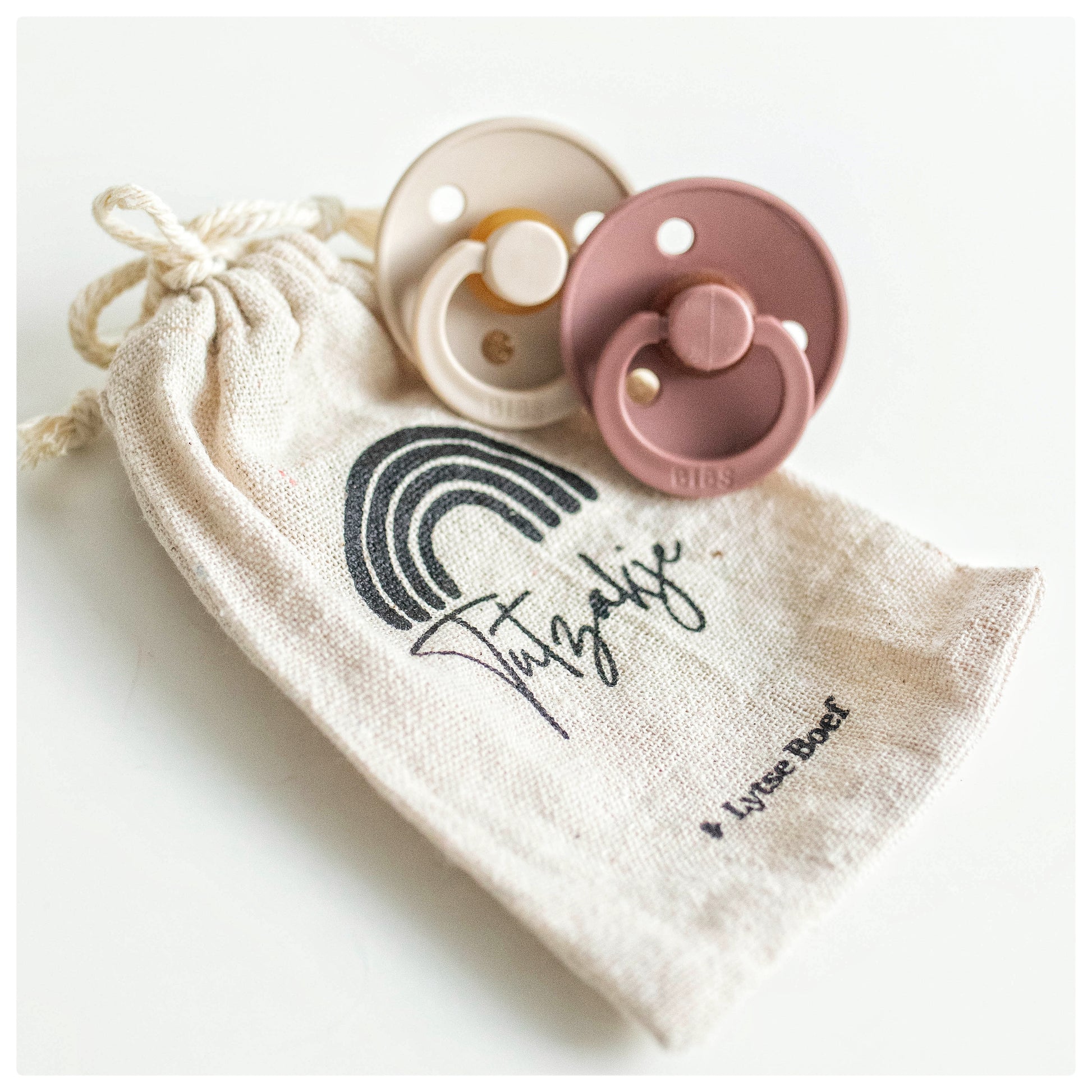 Het is een mix van ronde natuurrubber spenen van het merk Frigg en/of Bibs. Ze hebben allebei de ronde flexibele vorm tut.