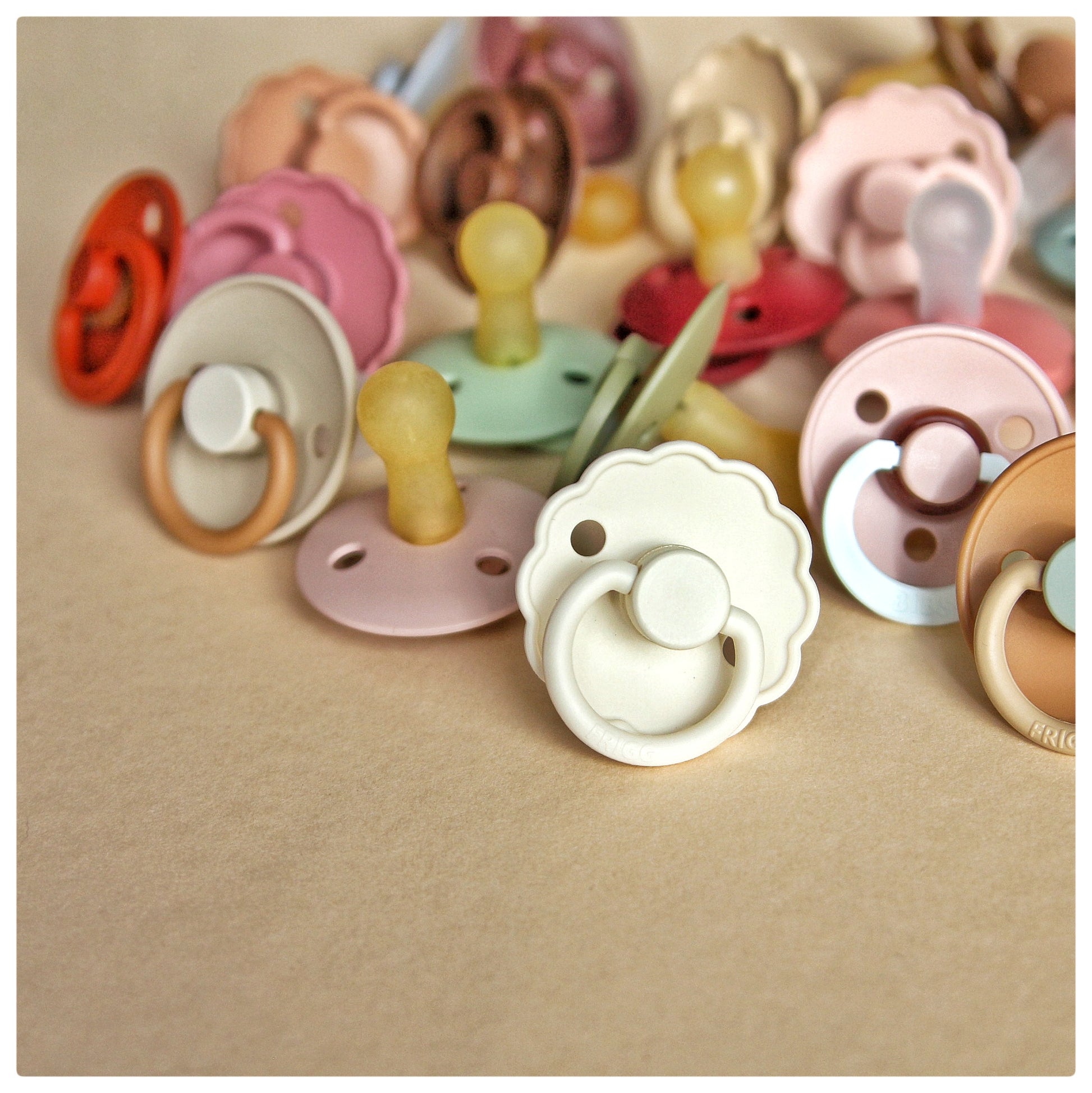 Het is een mix van ronde natuurrubber spenen van het merk Frigg en/of Bibs. Ze hebben allebei de ronde flexibele vorm tut.