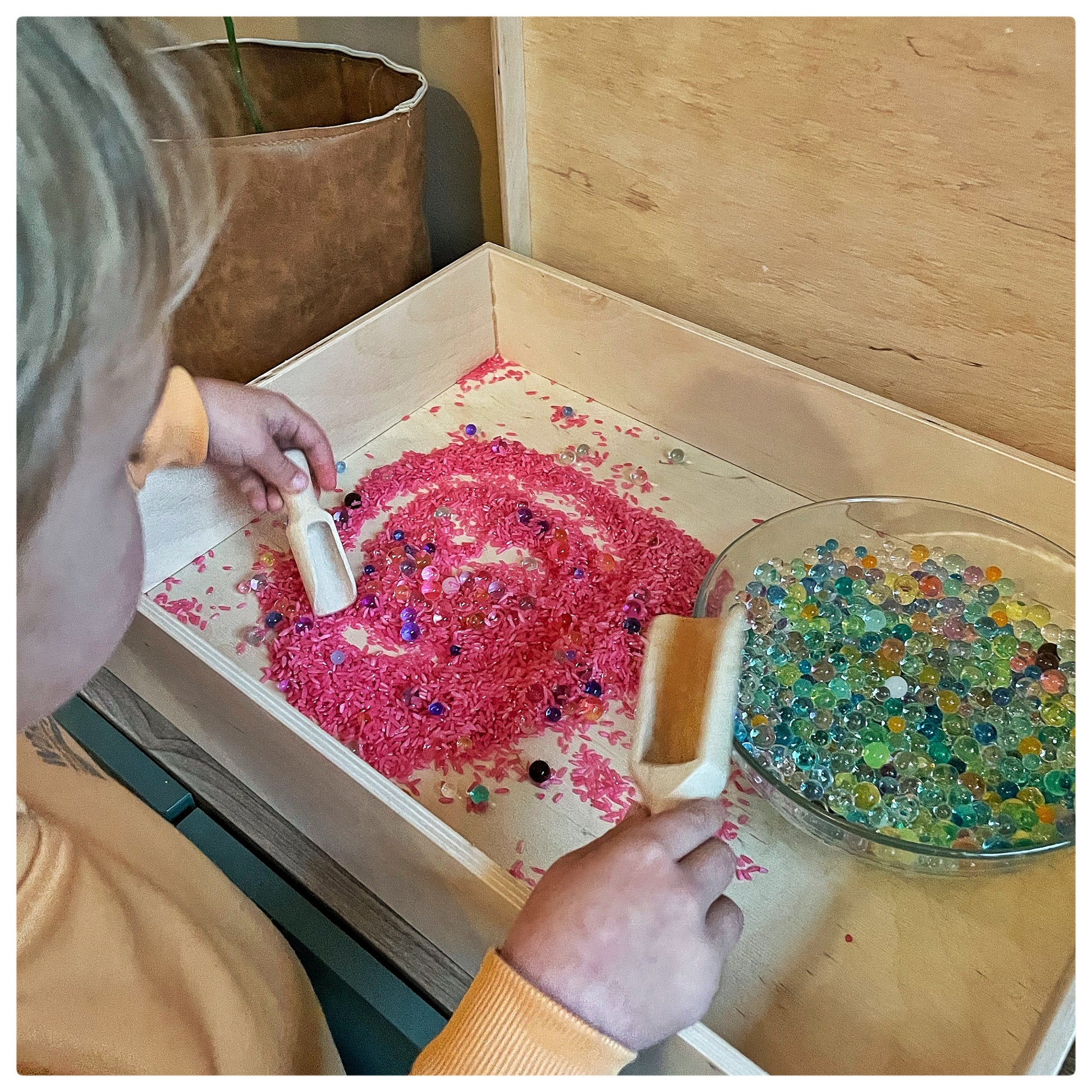 Doe de waterparels in een grote bak. Ons advies is om te beginnen met een klein beetje parels (10 gram). Per 10 gram gebruik je ongeveer 1,5 liter water. Na 1,5 a 2 uur zijn de parels klaar om mee te spelen, maar hoe langer je ze in het water laat, hoe groter ze worden. Na ongeveer 5 uur hebben ze de maximale grootte. Doe de parels in een vergiet om het water te verwijderen, zodat je met de parels kan gaan spelen!